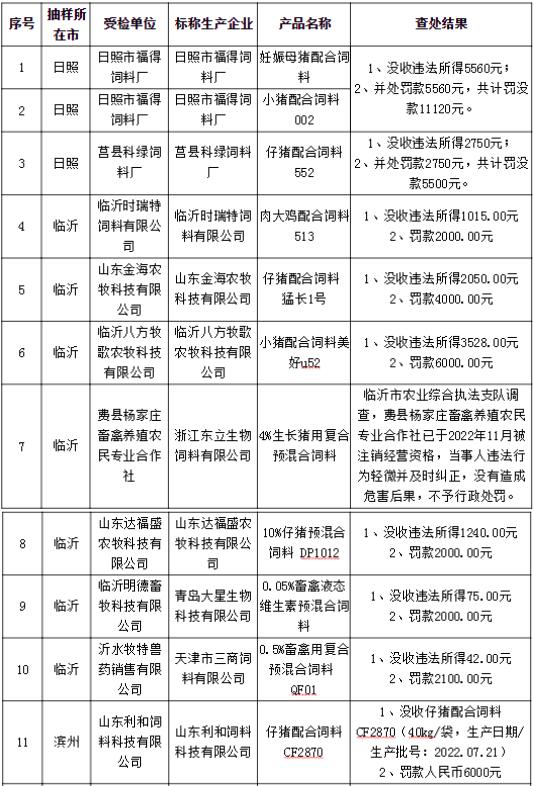 2022年度省級飼料監督抽檢不合格產品查處情況匯總