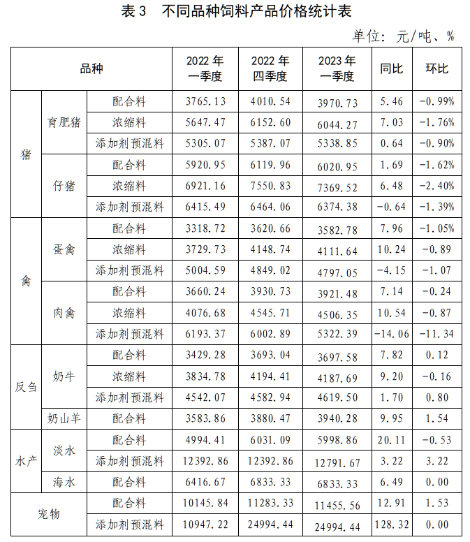 一季度,隨著大宗飼料原料豆粕價格的下跌,主要品種飼料產品價格呈現小幅下降趨勢。詳見表3。