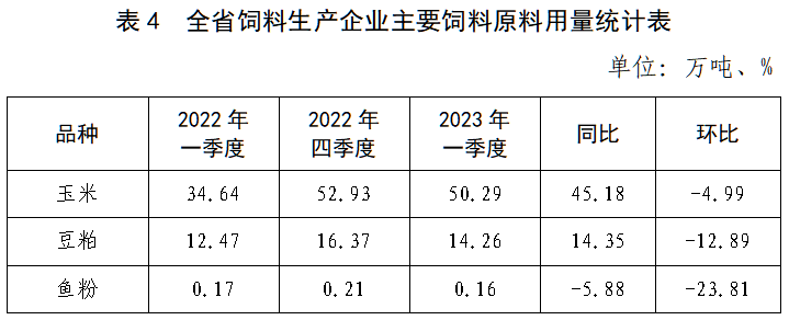 一季度,全省工業飼料生產企業玉米用量50.29萬噸,同比增長45.18%,環比下降4.99%;豆粕用量14.26萬噸,同比增長14.35%,環比下降12.89%;魚粉用量0.16萬噸,同比下降5.88%,環比下降23.81%。詳見表4。