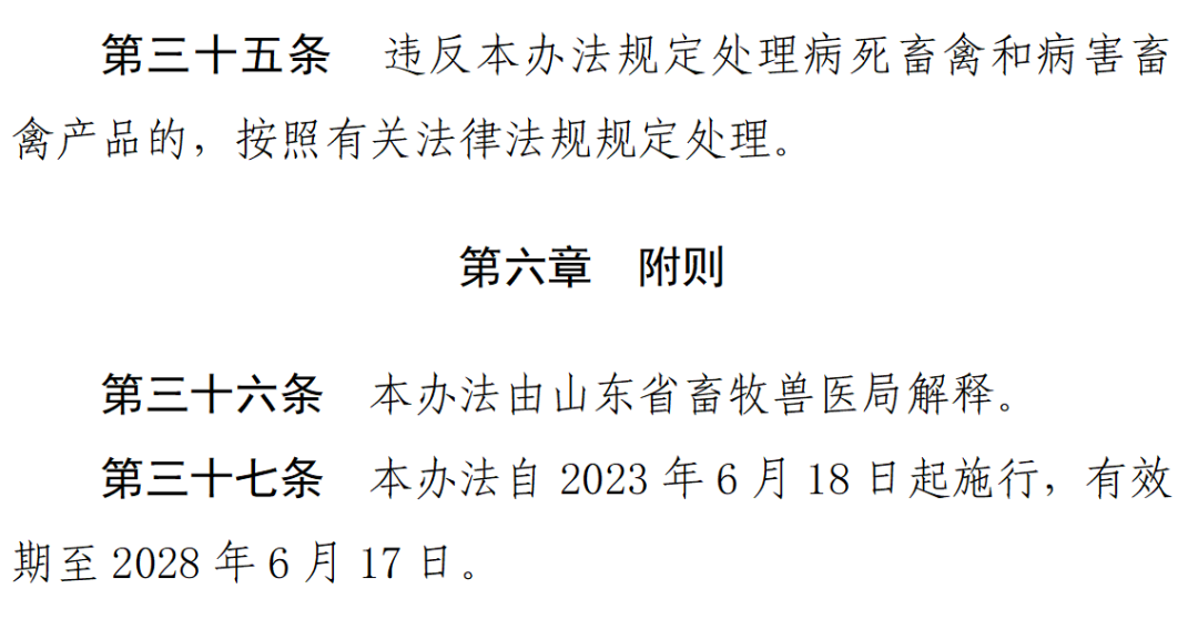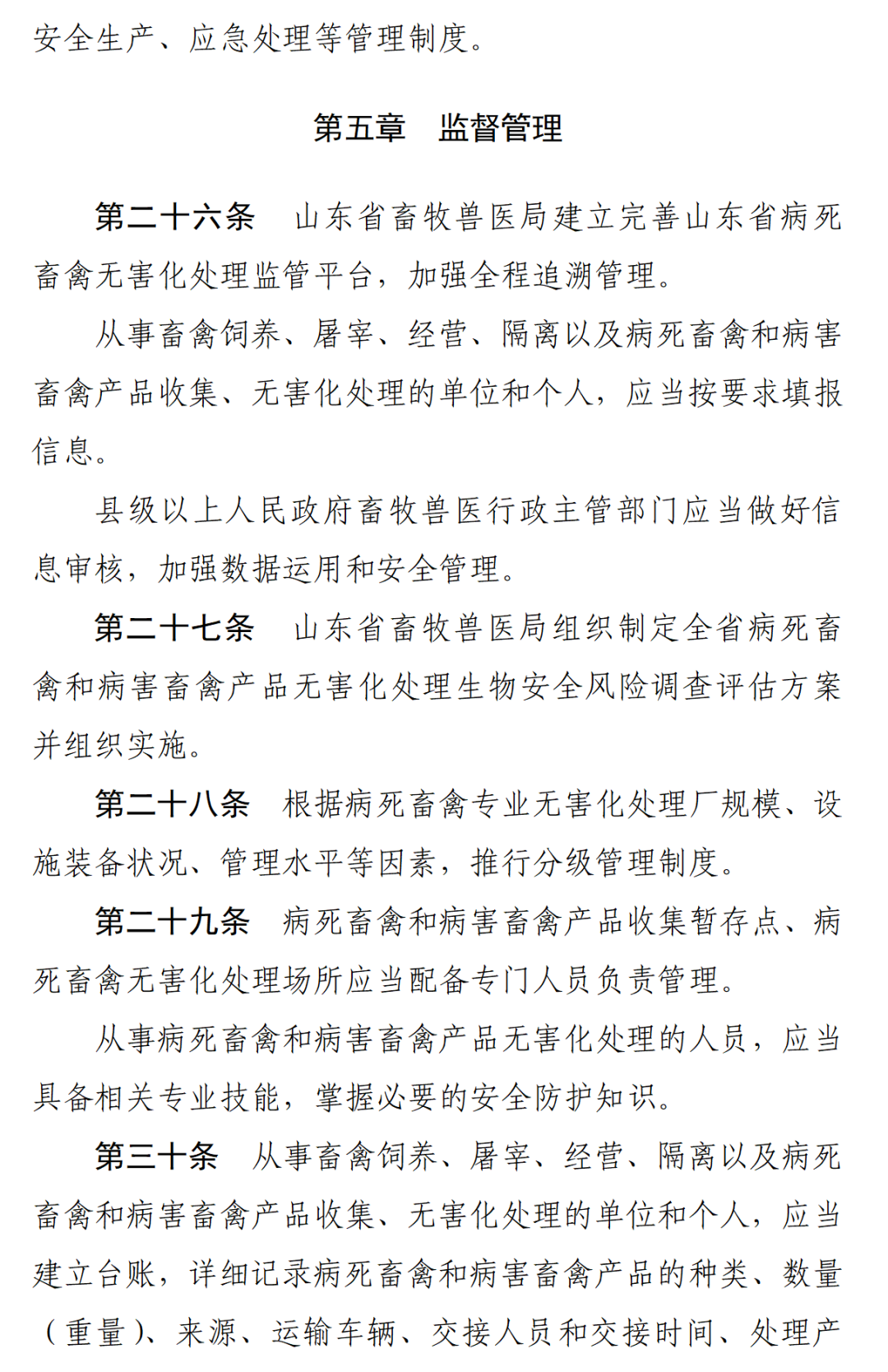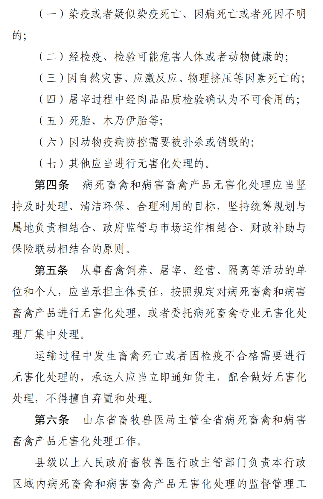 為加強山東省病死畜禽和病害畜禽產品無害化處理管理工作,防控動物疫病,促進畜牧業高質量發展,保障公共衛生安全和人體健康,根據《中華人民共和國動物防疫法》《山東省動物防疫條例》《病死畜禽和病害畜禽產品無害化處理管理辦法》等法律法規規章,山東省畜牧獸醫局制定了《山東省病死畜禽和病害畜禽產品無害化處理管理辦法》,具體內容如下。