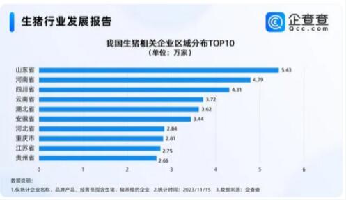 企查查數據顯示,從區域來看,山東現存5.43萬家生豬相關企業,位居第一。河南、四川分別現存4.79萬家、4.31萬家生豬相關企業,位居前三。此后是云南、湖北、安徽、河北等地。