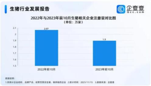 企查查數據顯示,截至目前,今年我國新增1.97萬家生豬相關企業。2022年及2023年前10月,分別新增生豬相關企業2.07萬家、1.9萬家,同比減少7.88%。