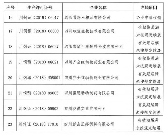 根據《飼料和飼料添加劑生產許可管理辦法》有關規定,四川斯特佳飼料有限公司等23家飼料和飼料添加劑企業的生產許可證符合法定注銷情形,現予注銷。