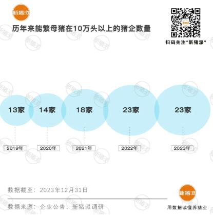 據新豬派統計,擁有10萬頭以上能繁母豬的豬企由2019年的19家增至2022年的23家。2023年維持在23家,均為TOP20豬企,其中16家為上市企業。德康農牧是2023年唯一成功登陸資本市場的養豬企業,有著超過30萬頭的母豬規模。