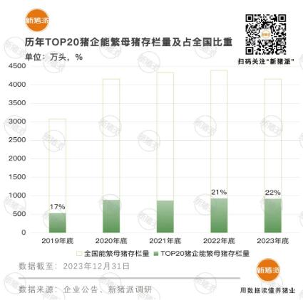 變局之下,迫于資金、非瘟壓力等影響,縮減母豬規模的養豬巨頭占據了多數。據新豬派統計,截至2023年底,我國TOP20豬企能繁母豬共計918萬頭,較2022年底下降1%,占全國總量的22%,其中13家企業紛紛下調母豬規模。能繁母豬超過10萬頭的企業仍保持在23家。