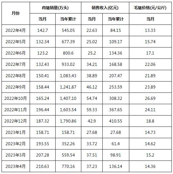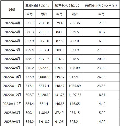 牧原股份5月6日公布2023年4月份生豬銷售簡報。2023年4月份,公司銷售生豬534.2萬頭(其中商品豬519.2萬頭,仔豬13.0萬頭,種豬2.0萬頭),銷售收入91.06億元。其中向全資子公司牧原肉食...