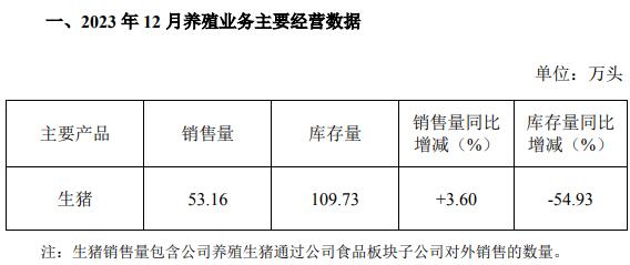 一、公司2023年12月銷售生豬45.76萬頭(其中仔豬28.34萬頭,商品豬17.42萬頭),環比上升13.15%,同比下降6.06%...