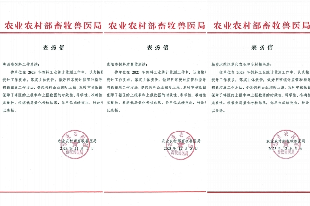 近日,農業農村部畜牧獸醫局發來表揚信,對陜西飼料工業統計監測工作通報表揚。