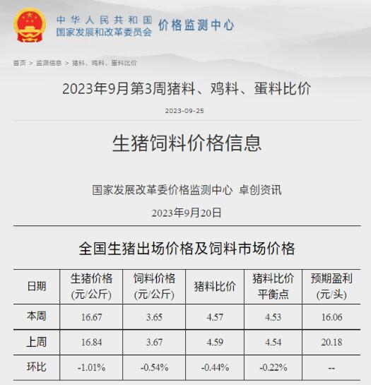 據國家發改委價格監測中心9月25日發布數據,2023年9月第3周全國豬料比價為4.57,環比下降0.44%。按目前價格及成本推算,未來生豬養殖頭均盈利為16.06元。
