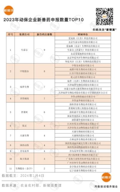 其中北京生泰爾及其控股子公司,以7家子公司共申報9個新獸藥產品,登頂2023年集團公司申報新獸藥總數第一名。中牧股份以8個新獸藥產品位列第二,瑞普生物和齊魯制藥并列第三,其中青島易邦以一家母公司申報4個新獸藥躋身前10,研發實力不容小覷。