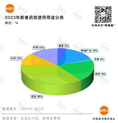 據新豬派統計,疫苗產品依然是主要新藥方向,2023年疫苗產品占比36%;檢測類和激素類占比稍有下降,分別占比14%和4%;由于寵物外用藥和中藥劑的數量有所增長,體外用藥占比13%,包括耳用滴劑、皮膚用藥及驅蟲滴劑等,中藥占比回升至12%。